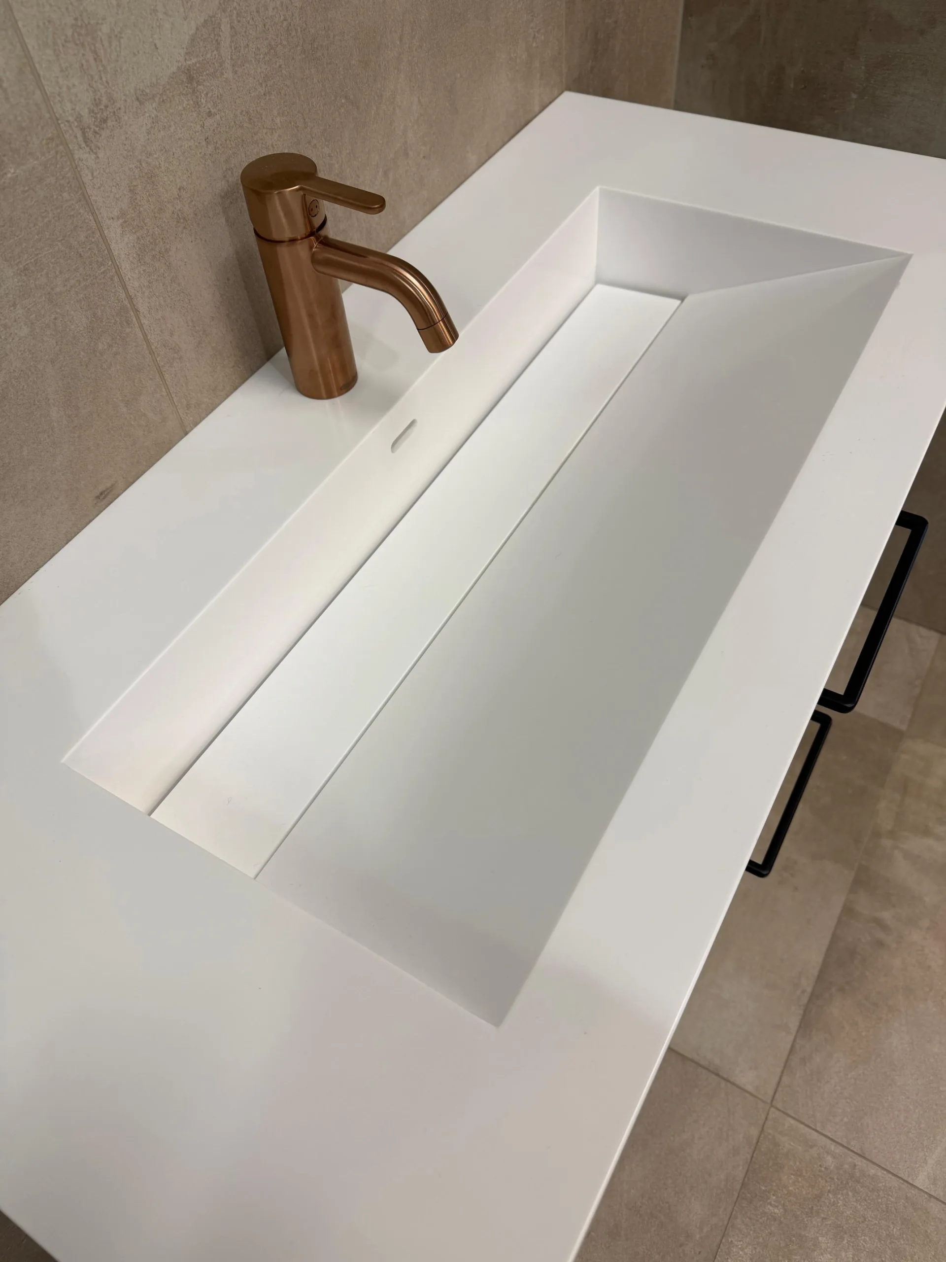 Servantskap med to skuffer, Corian vask med skrå bunn og 80×80 speil i heltre gråbrun eik medfølger.